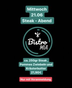 Am 21. Juni gibt es im Bistro Mia einen Steakabend. Ca. 250g Fleisch, Kräuterbutter, Pommes und Zwiebeln für nur 21,90 EUR. Bitte vorbestellen unter 52483 oder unter bistro.mia.sulzbach@gmail.com